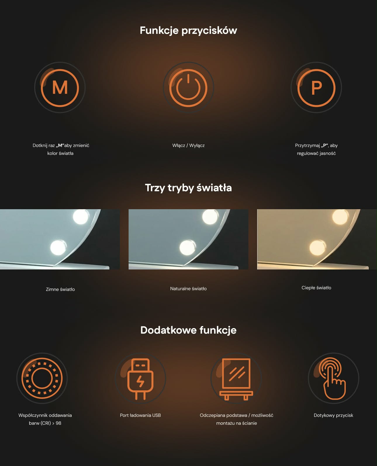Lustro wyposażone jest w trzy przyciski dotykowe: